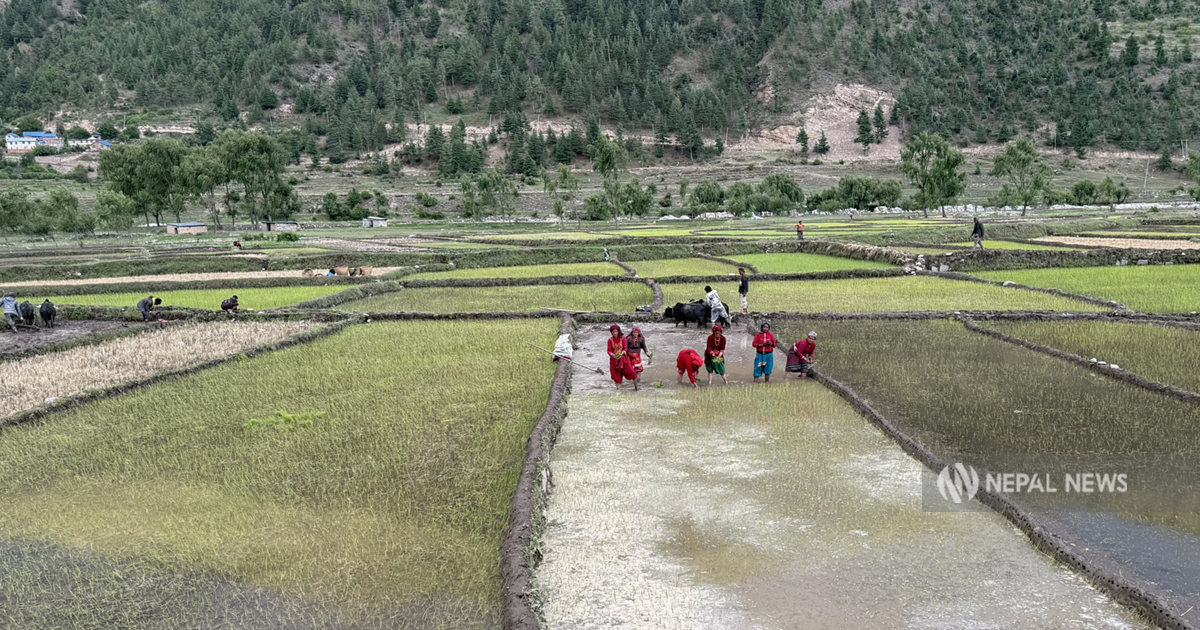 धान रोपिरहेका जुम्लाका किसान। तस्बिरहरू : कलेन्द्र सेजुवाल/नेपालन्युज