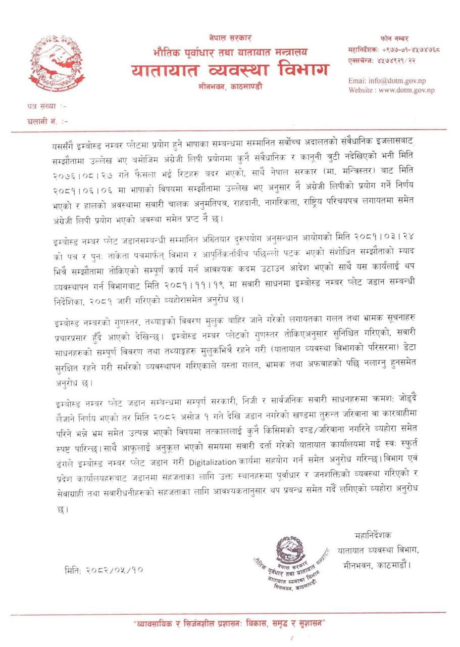 यातायात व्यवस्था विभागले मंगलबार जारी गरेको विज्ञप्तिमा सवारी दर्ता, नामसारी र नवीकरणका क्रममा इम्बोस्ड नम्बर प्लेट जडान गर्ने व्यवस्था भए पनि अब तत्काल बाध्यकारी नभई इच्छाअनुसार जडान गर्न सकिने स्पष्ट पारेको छ।