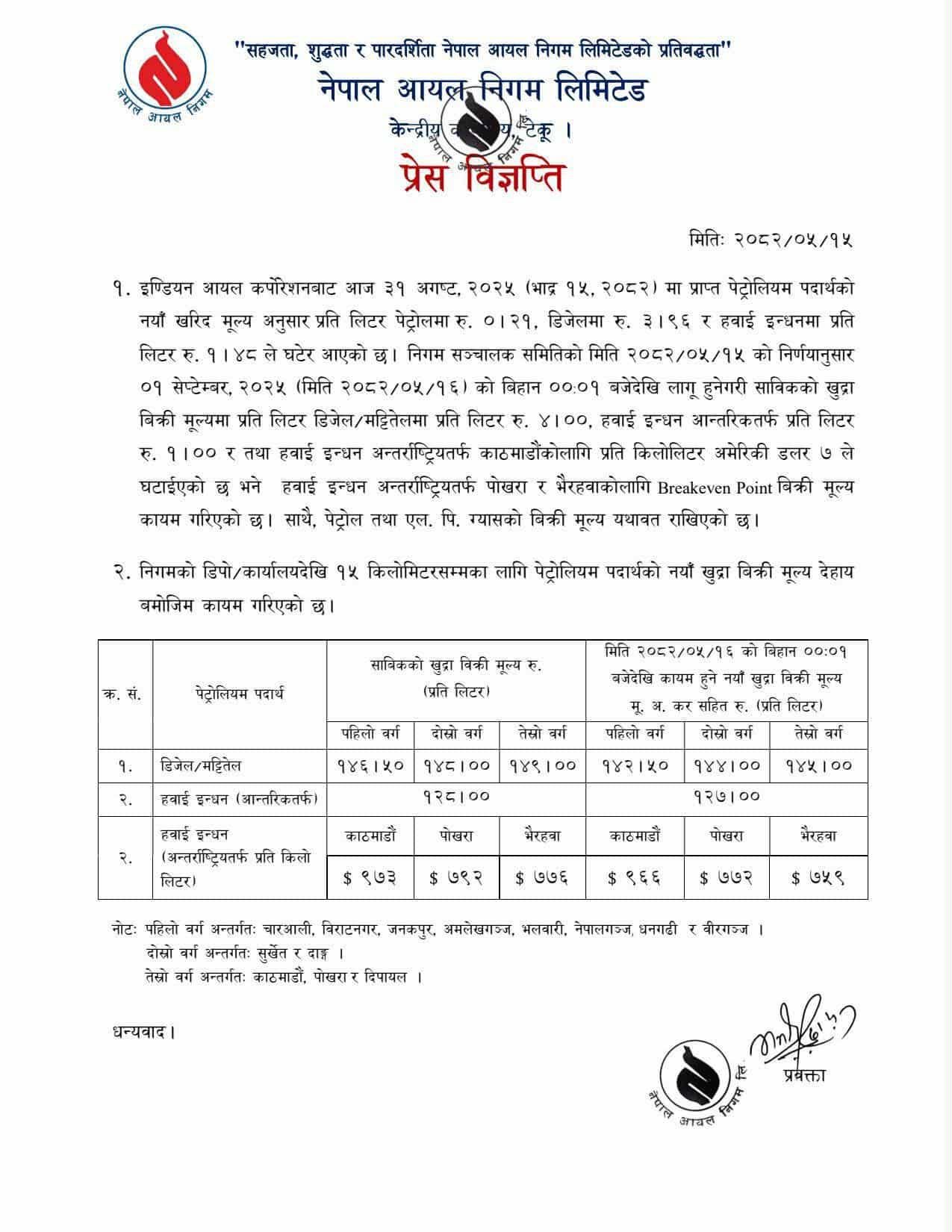 निगमका कार्यकारी निर्देशक चण्डिका प्रसाद भट्टका अनुसार डिजेल र मट्टितेलको मूल्य प्रतिलिटर ४ रुपैयाँले घटाइएको छ भने आन्तरिक हवाई इन्धनको मूल्य १ रुपैयाँले कम गरिएको छ। तर, पेट्रोल र एलपी ग्यासको मूल्य भने यथावत् राखिएको छ।