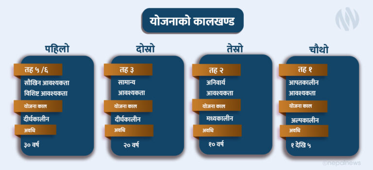 चार खण्डमा बाँडिएका योजनालाई दीर्घ, मध्य र अल्पकालसँगै वार्षिक खुड्किलाहरू तय गरी योजना बनाइनु पर्छ। योजना निर्माणमा अभियान, उद्देश्य, लक्ष्य, रणनीति र कार्यक्रम वा गतिविधि निश्चित हुनु पर्दछ। अभियान हाम्रो राष्ट्रिय नीतिद्वारा निर्देशित हुन्छ भने उद्देश्यले लक्षित प्रतिफल देखाँउछ। लक्ष्य भनेको खुड्किलो हो, यसले तलमाथि भएका बेला सुधार गर्न सहयोग गर्छ। रणनीति तमाम काम सम्पन्न गर्न अङ्गीकार गरिने नीति, कार्यक्रम, ऐन, नियम तथा सूक्ष्म रूपमा तयार पारिएको कार्ययोजना हो। कार्यक्रम वा गतिविधि भन्नाले उपर्युक्त नीति नियम पालन गरेर सम्पन्न गरिने कामहरू बुझ्नु पर्दछ।