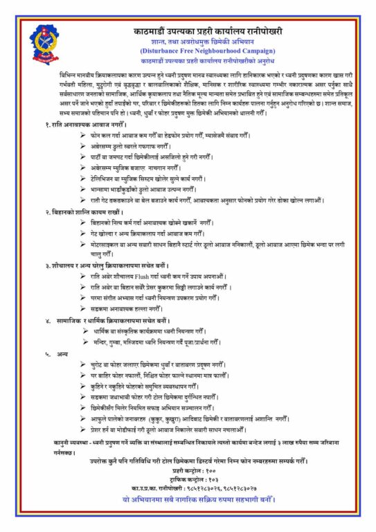 काठमाडौं। काठमाडौं उपत्यका प्रहरीले राजधानीवासीका लागि सूचना जारी गरेको छ। काठमाडौं उपत्यका प्रहरी कार्यालय, रानीपोखरीले ‘ध्वनि, धुँवा र फोहरमुक्त छिमेकी अभियान’ अन्तर्गत यस्तो सूचना सार्वजनिक गरेको हो।