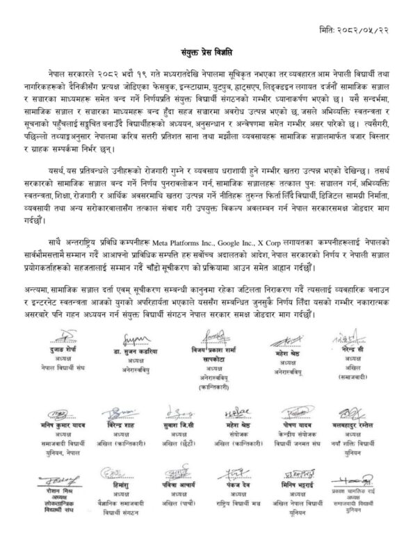 काठमाडौं। सरकारले सूचीकृत नभएका सामाजिक सञ्जाल बन्द गर्ने निर्णय गरेपछि १७ वटा विद्यार्थी संगठन, जसमा सत्तारुढ दल निकटका समेत छन्, उक्त कदमको विरोधमा उत्रिएका छन्।