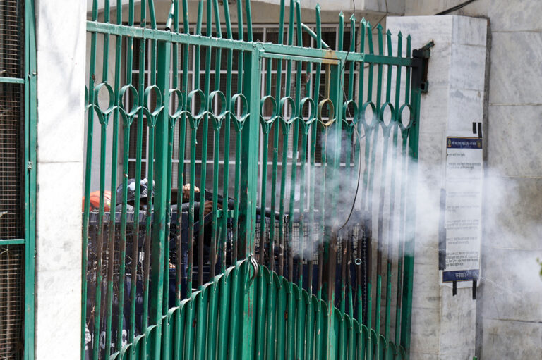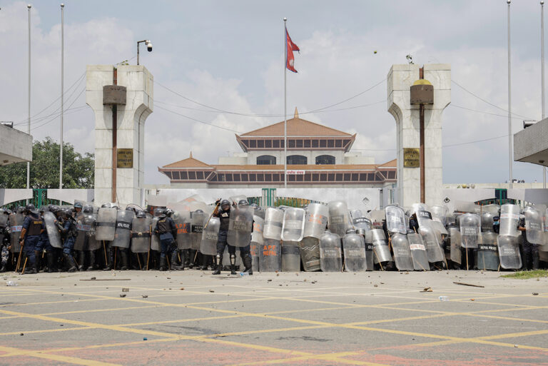 संसद भवनलाई चारैतिरबाट घेर्दै नाराबाजी गरिरहेका बेला एक हुल प्रदर्शनकारी भवनको पश्चिम गेट पुग्यो। केही बेरको नाराबाजी र होहल्लापछि प्रहरीसँगको मुठभेड सुरु भयो। भवनको पश्चिम गेट भत्काउने प्रयास गरेपछि प्रहरीले प्रदर्शकारीमाथि टियर ग्याँस प्रहार गर्यो। प्रदर्शकारीले टियर ग्याँसको बदलामा ढुंगामुढा प्रहार गर्न थालेपछि प्रहरीले रबरको गोली चलायो।