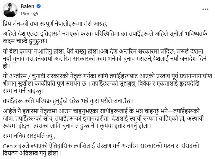 बालेनले फेसबुक पोस्टमा राष्ट्रपतिलाई सम्बोधन गर्दै लेखेका छन्, ‘जेनजीहरूले ल्याएको ऐतिहासिक क्रान्तिलाई संरक्षण गर्न अन्तरिम सरकारको गठन र संसद विघटन अविलम्ब गर्नु होला।’ उनले अहिलेको विषम परिस्थितिमा धैर्य र संयम राख्न जेन-जी पुस्तालाई आग्रह गर्दै, अब बन्ने अन्तरिम सरकारको मुख्य काम चुनाव गराएर देशलाई नयाँ जनादेश दिनु रहेको स्पष्ट पारेका छन्।