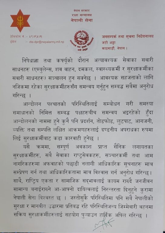 “आन्दोलनको नाममा हुने कुनै पनि प्रदर्शन, तोडफोड, लुटपाट, आगजनी, व्यक्ति तथा सम्पत्तिलक्षित आक्रमणलाई दण्डनीय अपराधका रूपमा लिई कडा कारबाही हुनेछ,” जंगी अड्डाले जारी गरेको सूचनामा भनिएको छ।