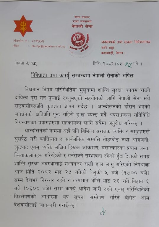 साँझ ५ बजेपछि भने भोलि बिहान ६ बजेसम्म कर्फ्यू आदेश जारी हुने सेनाले जनाएको छ। ‘त्पश्चात् भोलि भाद्र २६ गते बिहान ६ बजेसम्म कर्फ्यू आदेश जारी रहने’, सेनाको सूचनामा उल्लेख छ। कर्फ्यूको समयमा अत्यावश्यक कामबाहेक बाहिर ननिस्किएर सहयोग पुर्याउन सेनाले जनतालाई अनुरोध गरेको छ।