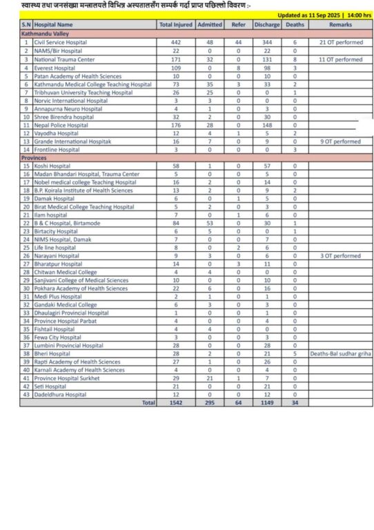 स्वास्थ्य तथा जनसंख्या मन्त्रालयले अहिलेसम्म देशभरिका अस्पतालमा उपचार गराइरहेका तथा ज्यान गएकाहरूको संख्या सार्वजनिक गरेको छ। मृतकहरूको पहिचानसहित विस्तृत विवरण सार्वजनिक गरेको छैन।