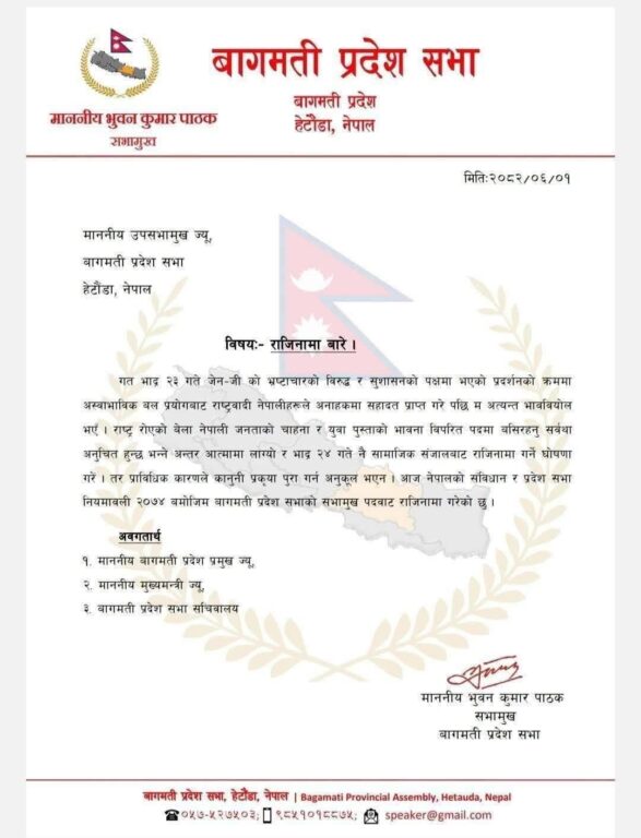 काठमाडौँ। वाग्मती प्रदेशसभाका सभामुख भुवन पाठकले पदबाट राजीनामा दिएका छन्।