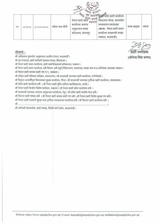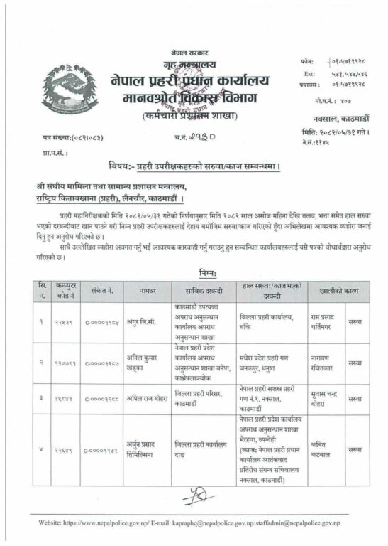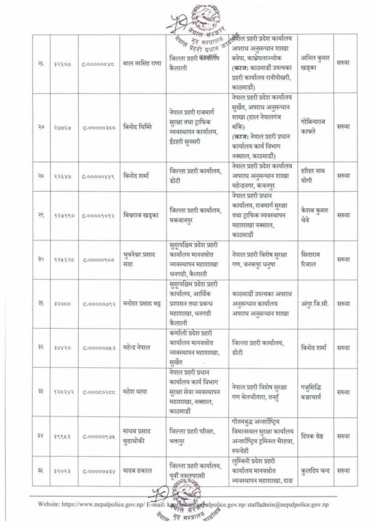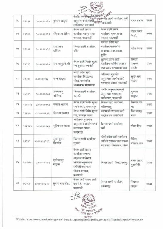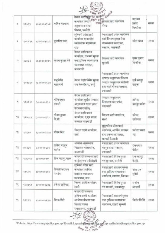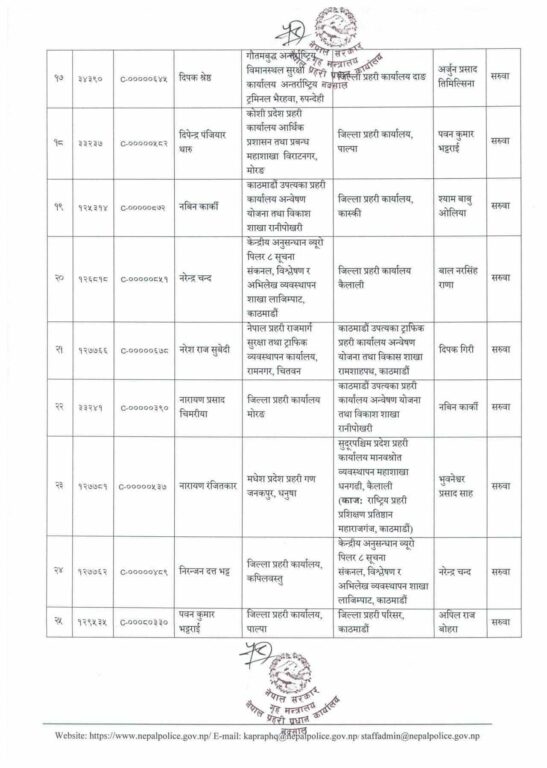 मोरङका प्रहरी उपरीक्षक नारायण चिमरियाको सरुवा भएको छ। त्यहाँ एसपी कवित कट्वालको सरुवा भएको छ। बाँकेमा अपराध अनुसन्धान कार्यालयमा कार्यरत् अंगुर जिसीको सरुवा भएको छ।