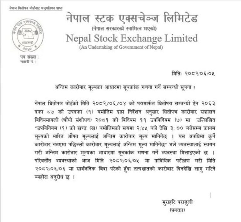 काठमाडौँ। नेपाल स्टक एक्सचेन्ज (नेप्से)ले अन्तिम १५ मिनेटको भारित औसत गणना विधि हटाएको छ।