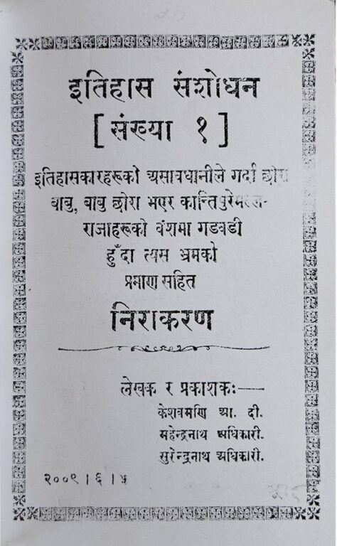 २००९ सालमा प्रकाशित संशोधन–मण्डलको पहिलो ‘इतिहास संशोधन’ पर्चाको शीर्षक हो यो।