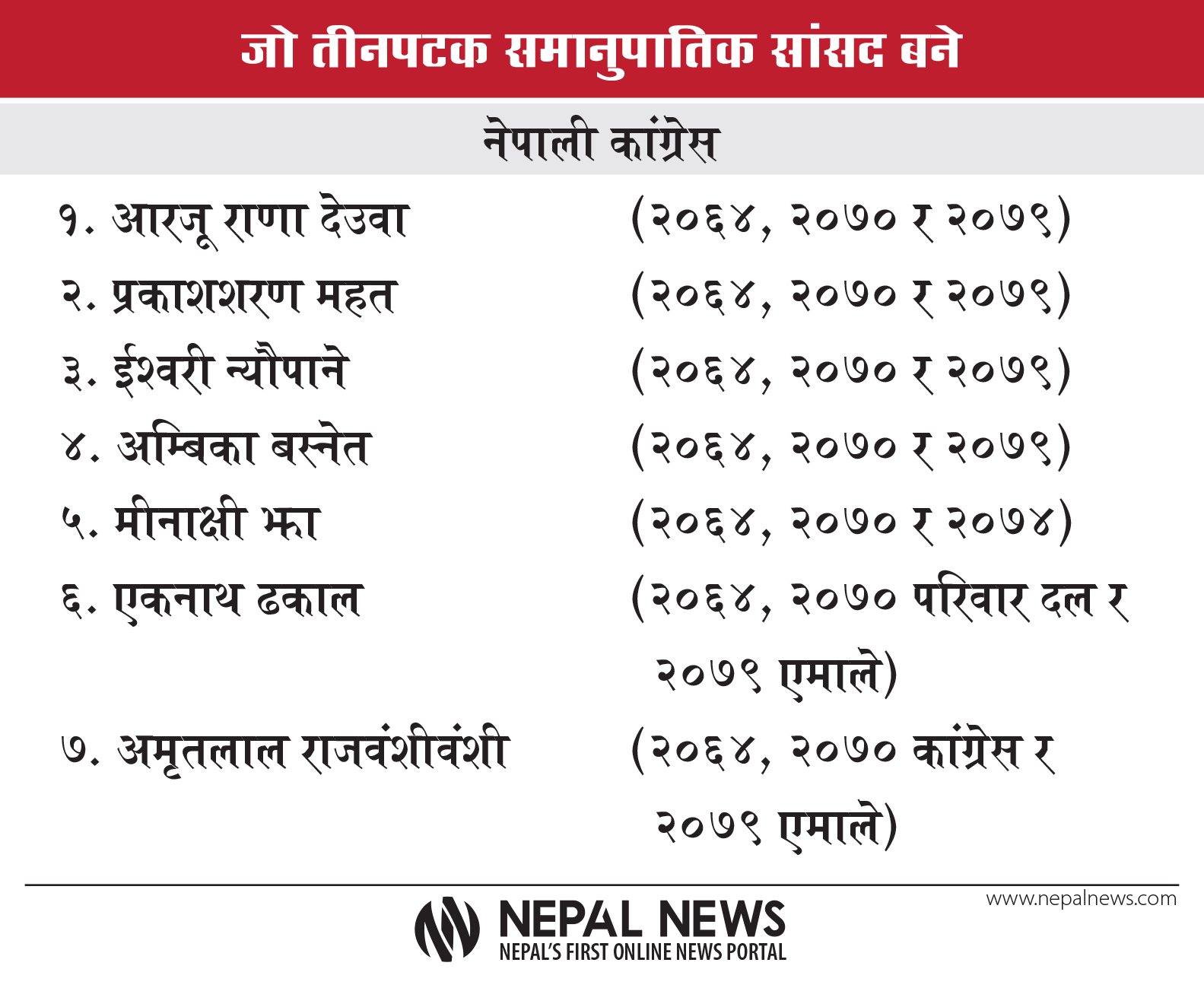 कांग्रेसकै अन्य चार नेताले पनि यसरी नै तीनपटक सांसद बन्ने मौका पाएका छन्, जसमा पार्टी प्रवक्ता प्रकाशशरण महत, केन्द्रीय सदस्य आरजु राणा देउवा, ईश्वरी न्यौपाने र अम्बिका बस्नेत छन्। राणा पार्टी सभापति शेरबहादुर देउवापत्नी र अरू देउवानिकट हुन्। मिनाक्षी झा भने विमलेन्द्र निधिनिकट मानिन्छिन्।