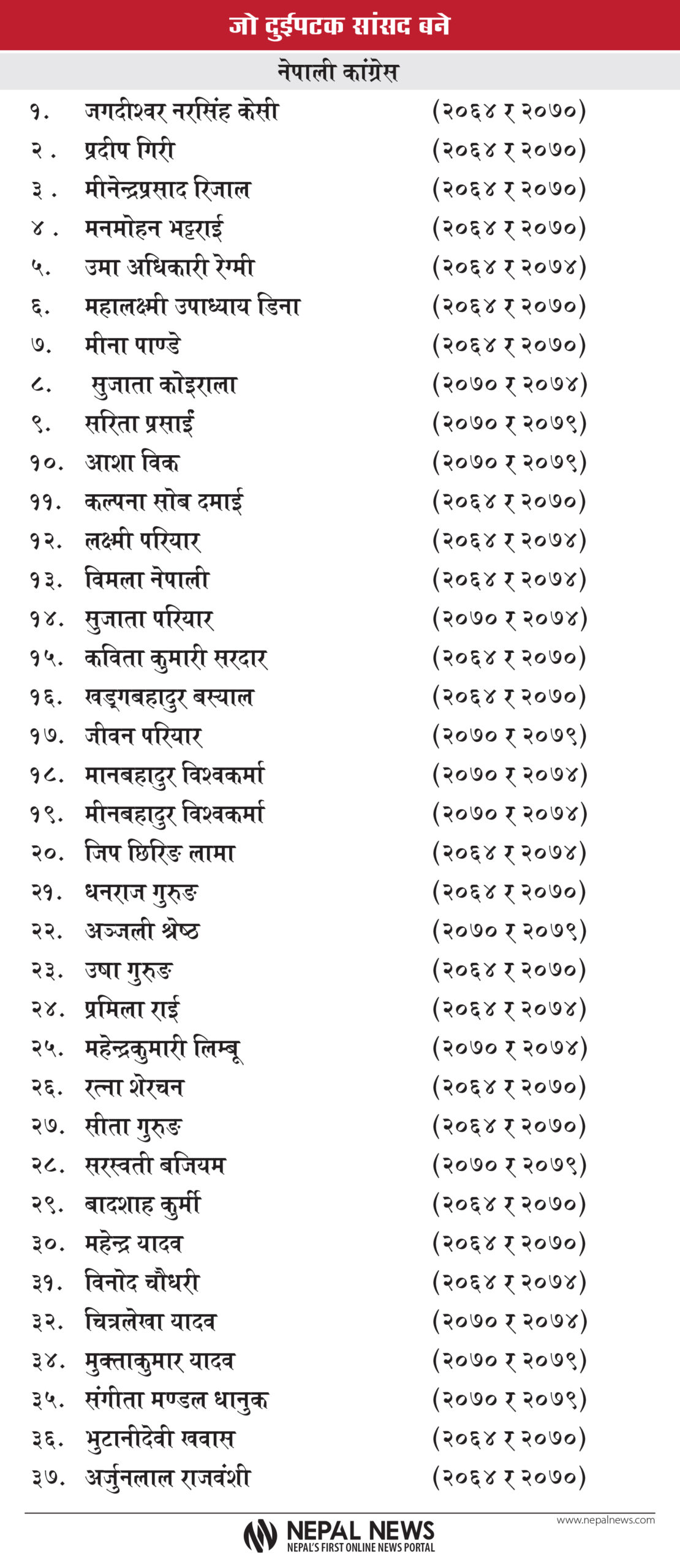 विघटित संसद्मा एमालेबाट सांसद रहेका एकनाथ ढकाल र अमृतलाल राजवंशी पनि तीनपटक नै समानुपातिक सांसद बन्नेमा पर्छन्। ५४ भन्दा बढी नेता सांसदका रूपमा समानुपातिकतर्फ दोहोरिएका छन्। यसरी अवसर पाउनेमा कांग्रेसका सबैभन्दा बढी छन्। दोस्रो स्थानमा नेकपा (एमाले)का छन्। एमालेले नदोहोर्याउने नीति लिए पनि ६ जना नेता दोस्रोपटक सांसद बनेका छन्।