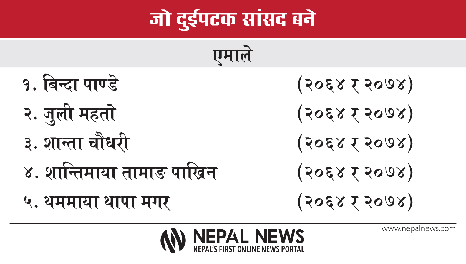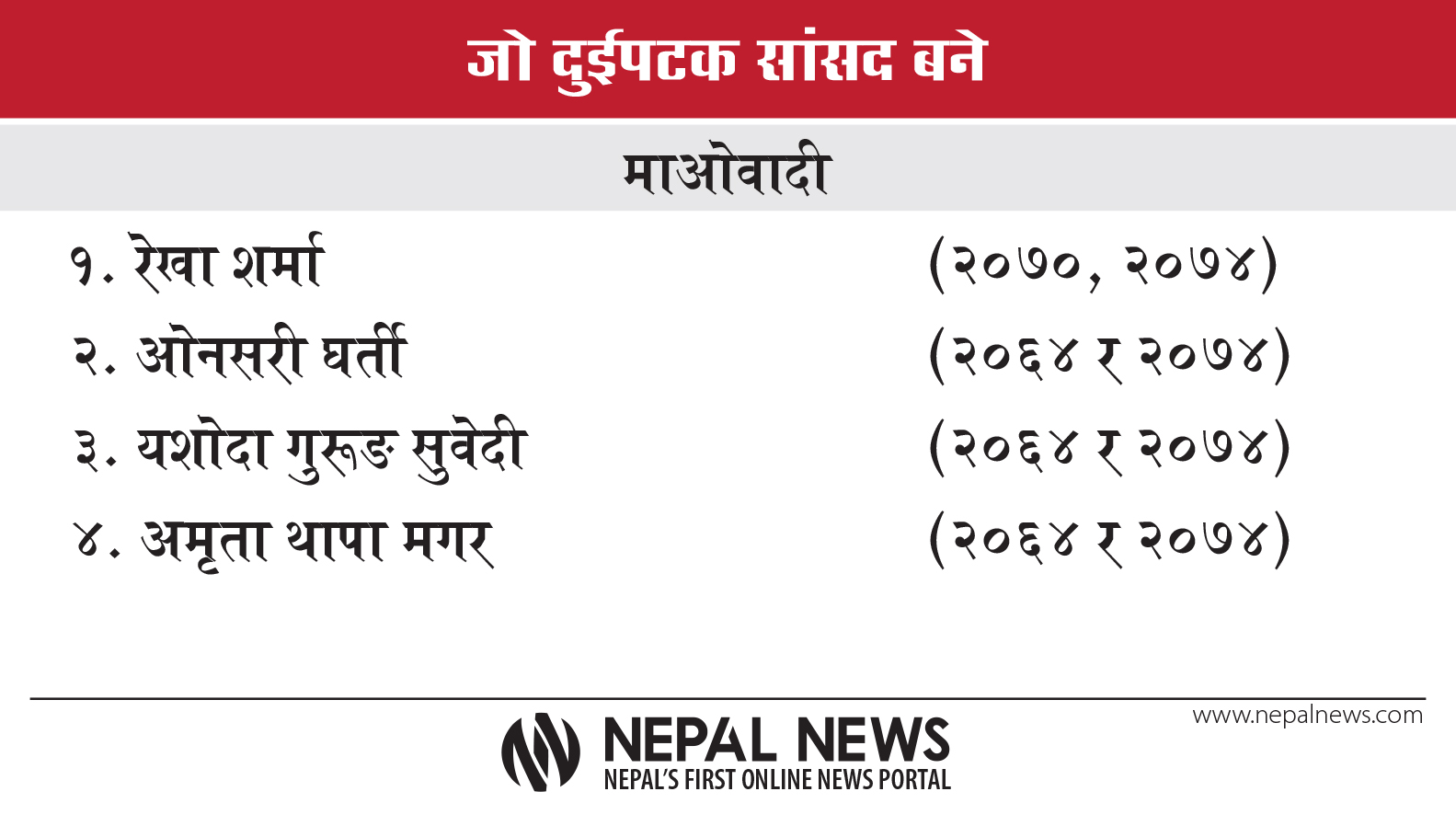 अर्की केन्द्रीय सदस्य सीता गुरुङ समानुपातिकबाट दुवै संविधानसभामा पुगिन्। उनले त्यसपछि दुई चुनाव तेह्रथुममा प्रत्यक्ष लडिन्। पहिलोपटक हार बेहोरिन्, दोस्रोमा जित निकालिन्। माओवादी केन्द्रकी रेखा शर्मा २०७० र २०७४ सालमा समानुपातिक सांसद बनिन्। उनले दाङ २ मा एमालेका महासचिव शंकर पोखरेललाई पराजित गरिन्। गुरुङ र शर्मा क्रमश: कांग्रेस र माओवादीबाट प्रत्यक्ष चुनाव जित्ने एक्ला महिला सांसद हुन्। माओवादीकी ओनसरी घर्ती मगर २०६४ र २०७४ मा समानुपातिकबाट सांसद थिइन्। २०७९ सालमा काठमाडौँ २ बाट रास्वपाकी सोबिता गौतमले चुनाव जित्दा घर्ती चौथो स्थानमा रहिन्।