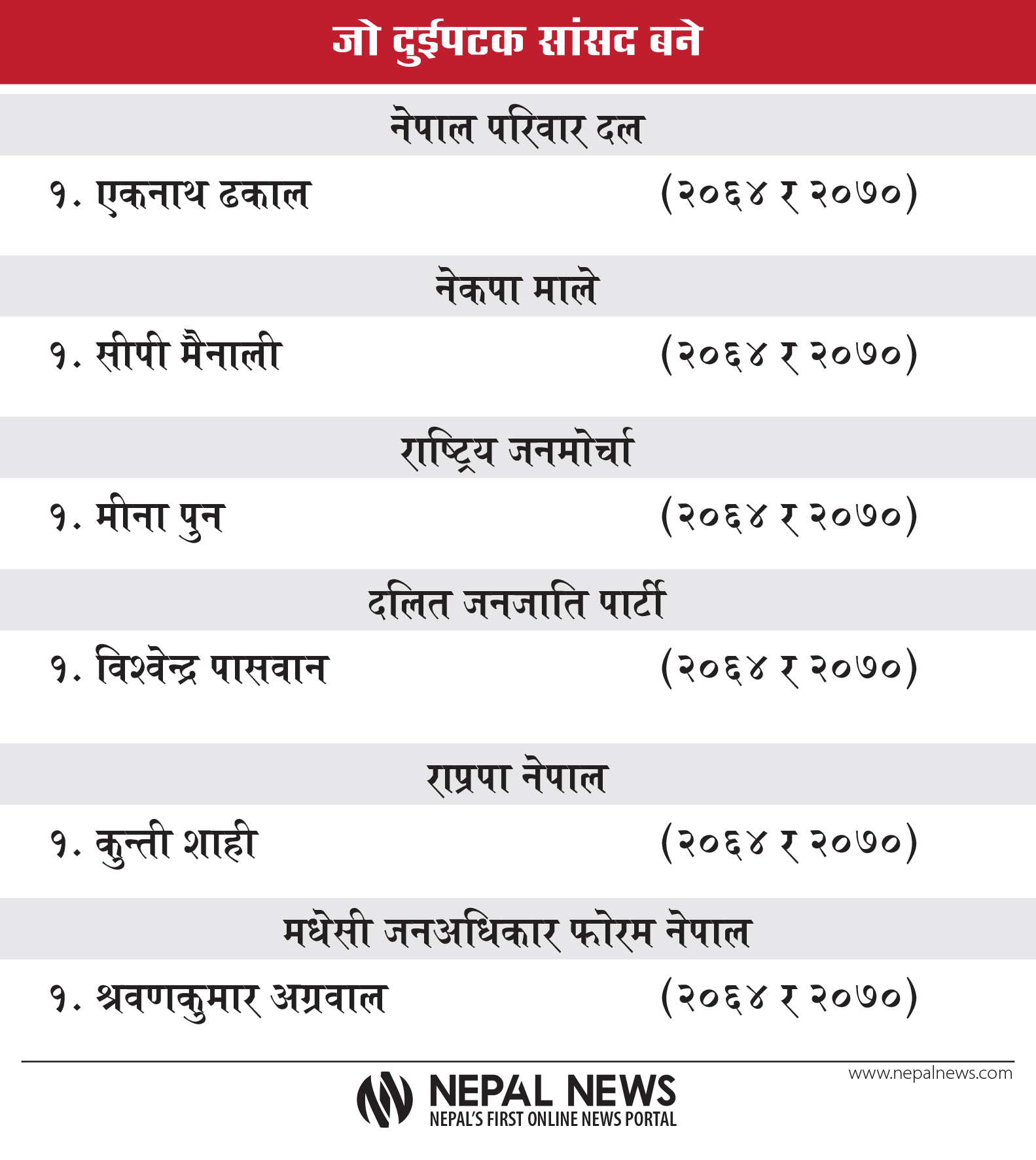 २०६४ यताका चार निर्वाचनमा दलका शक्तिशाली नेताले समानुपातिकमा आफन्त र निकटकालाई बनाए दोहोर्याई तेहेर्याई सांसद