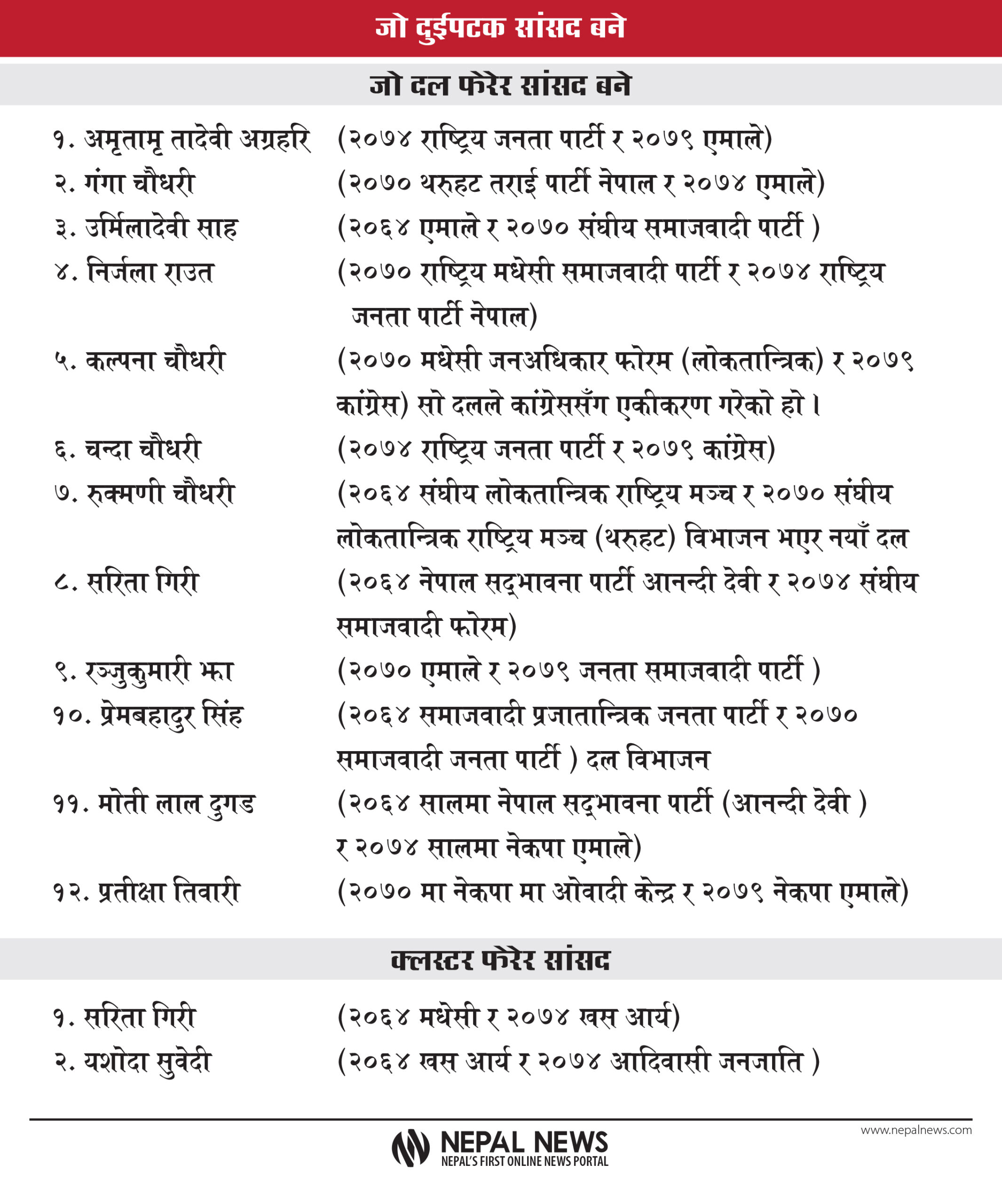 झापाका राजवंशी पहिलो र दोस्रो संविधानसभामा कांग्रेसबाट समानुपातिकतर्फका सभासद् चुनिएका थिए। उनी २०७९ सालको चुनावको ठीकअघि एमालेमा प्रवेश गरी समानुपातिकबाटै निर्वाचित भए। राजवंशीजस्तै मोरङका मोतीलाल दुगड पनि दल फेरेर दोस्रोपटक समानुपातिक सांसद बने। २०६४ सालमा नेपाल सद्भावना पार्टी (आनन्दीदेवी)बाट समानुपातिक सांसद बनेका दुगडले २०७० सालमा नवनिर्माण पार्टी नेपाल गठन गरेका थिए। तर निर्वाचनमा कुनै प्रभाव पार्न नसकेपछि एमालेमा प्रवेश गरे र २०७४ सालमा समानुपातिक सांसद भए।