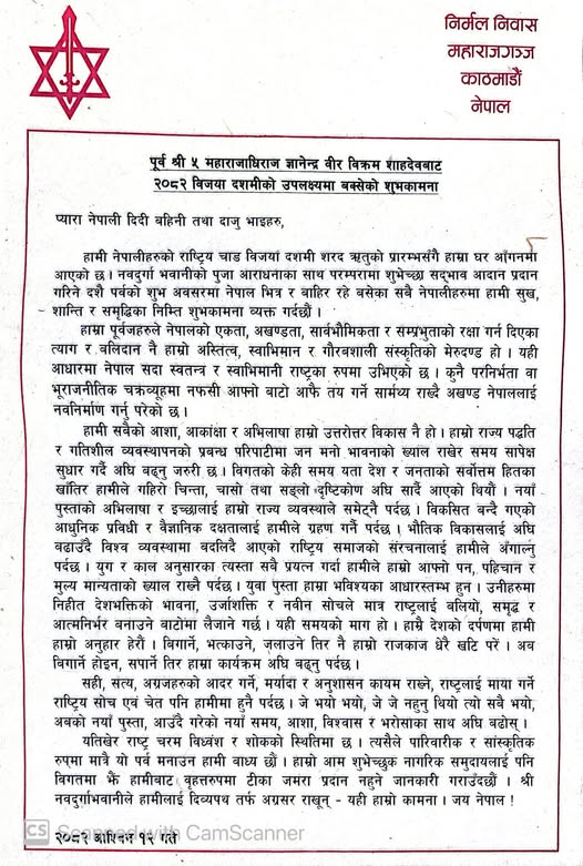 पूर्वराजा शाहले भनेका छन्, ‘हाम्रो आम शुभेच्छुक नागरिक समुदायलाई विगतमा झैं हामीबाट बृहत् रूपमा टीका–जमरा प्रदान नहुने जानकारी गराउँदछौँ।’