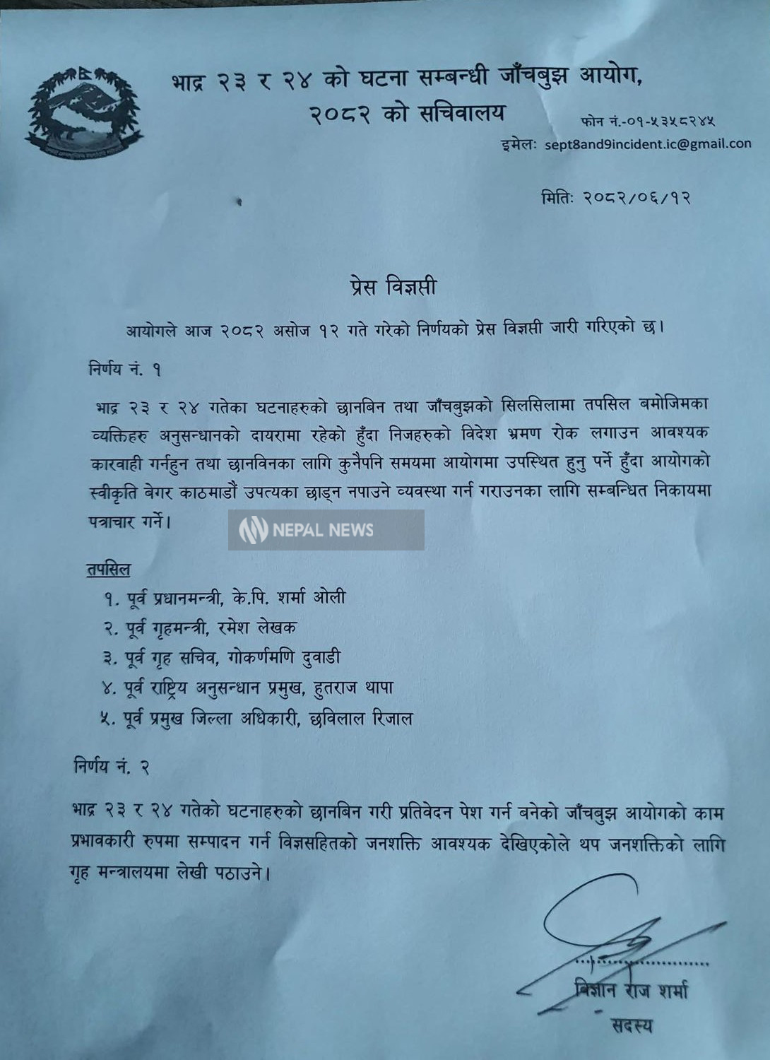 २३ र २४ गतेको घटनासम्बन्धी जाँचबुझ आयोगले अनुसन्धानको दायरामा रहेको हुँदा उनीहरूको विदेश भ्रमणमा रोक लगाउन र कुनै पनि समय आयोगमा उपस्थित हुनुपर्ने हुँदा स्वीकृतिबेगर काठमाडौँ उपत्यका छाड्न नपाउने निर्णय गर्न सरकारलाई सिफारिस गरेको थियो।