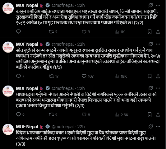 अर्थ मन्त्रालयले आफ्नो सामाजिक सञ्जाल ‘एक्स’ (ट्विटर) मार्फत् धेरै विदेशी मुद्रा साथमा नराख्न भनेको हो।