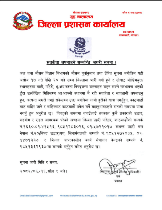 ‘जल तथा मौसम विज्ञान विभागको मौसम पूर्वानुमान तथा प्रेषित सूचनाबमोजिम २० गतेसम्म भारी वर्षा हुने र सोबाट जोखिमयुक्त स्थानहरुमा बाढी, पहिरो, भूक्षयजस्ता विपद्जन्य घटना हुने सम्भावना भएकाले आफ्नो स्थानमा रही सतर्कता र सावधानी अपनाउन’ जारी विज्ञप्तिमा भनिएको छ ।