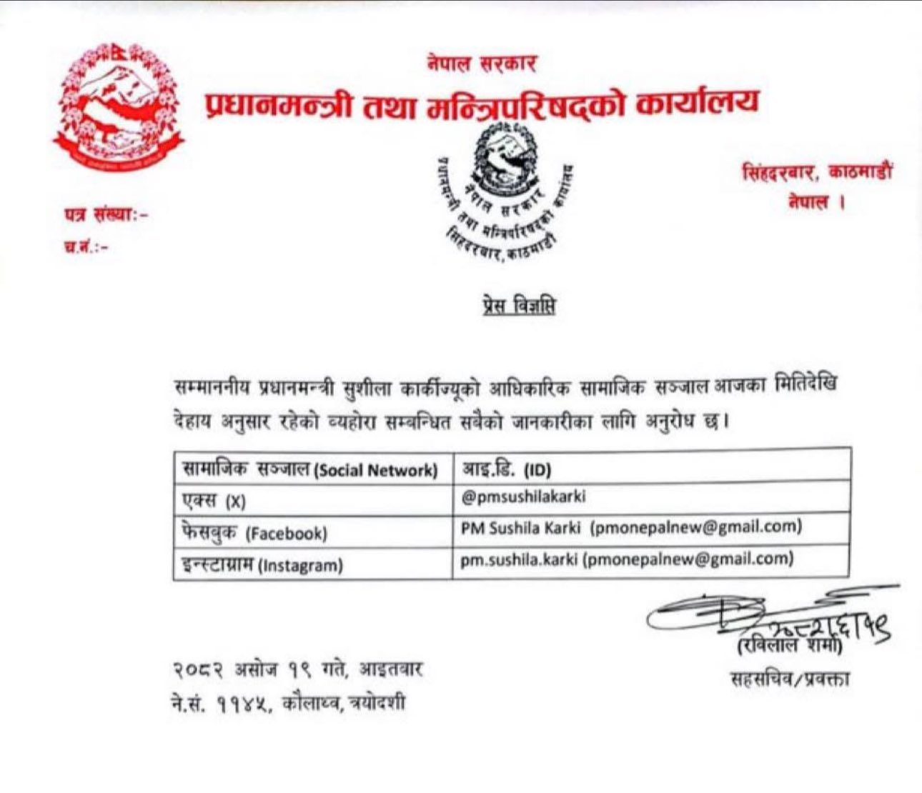 विज्ञप्तिअनुसार, अबदेखि प्रधानमन्त्री कार्कीका तर्फबाट सामाजिक सञ्जालमा प्रवाहित हुने आधिकारिक जानकारीहरू निम्न खातामार्फत उपलब्ध हुनेछन्। प्रधानमन्त्रीको आधिकारिक एक्स (X) मा @pmsushilakarki, फेसबुकमा PM Sushila Karki ([email protected]), इन्स्टाग्राममा pm.sushila.karki ([email protected]) रहेको जनाइएको छ।