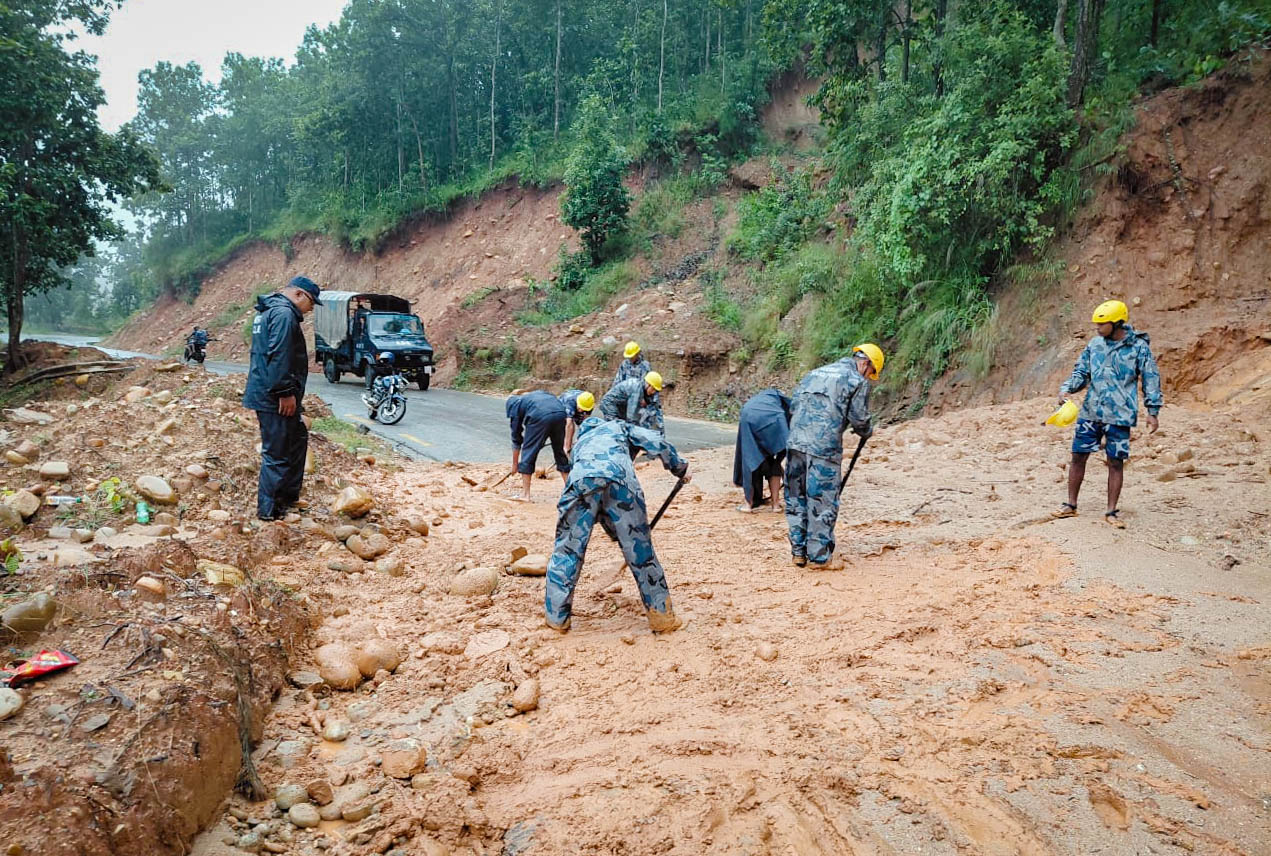 सिन्धुपाल्चोकमा अरनिको राजमार्गमा पहिरो पन्छाउँदै सशस्त्र प्रहरी। तस्बिर- सशस्त्र प्रहरीको फेसबुक पेजबाट।