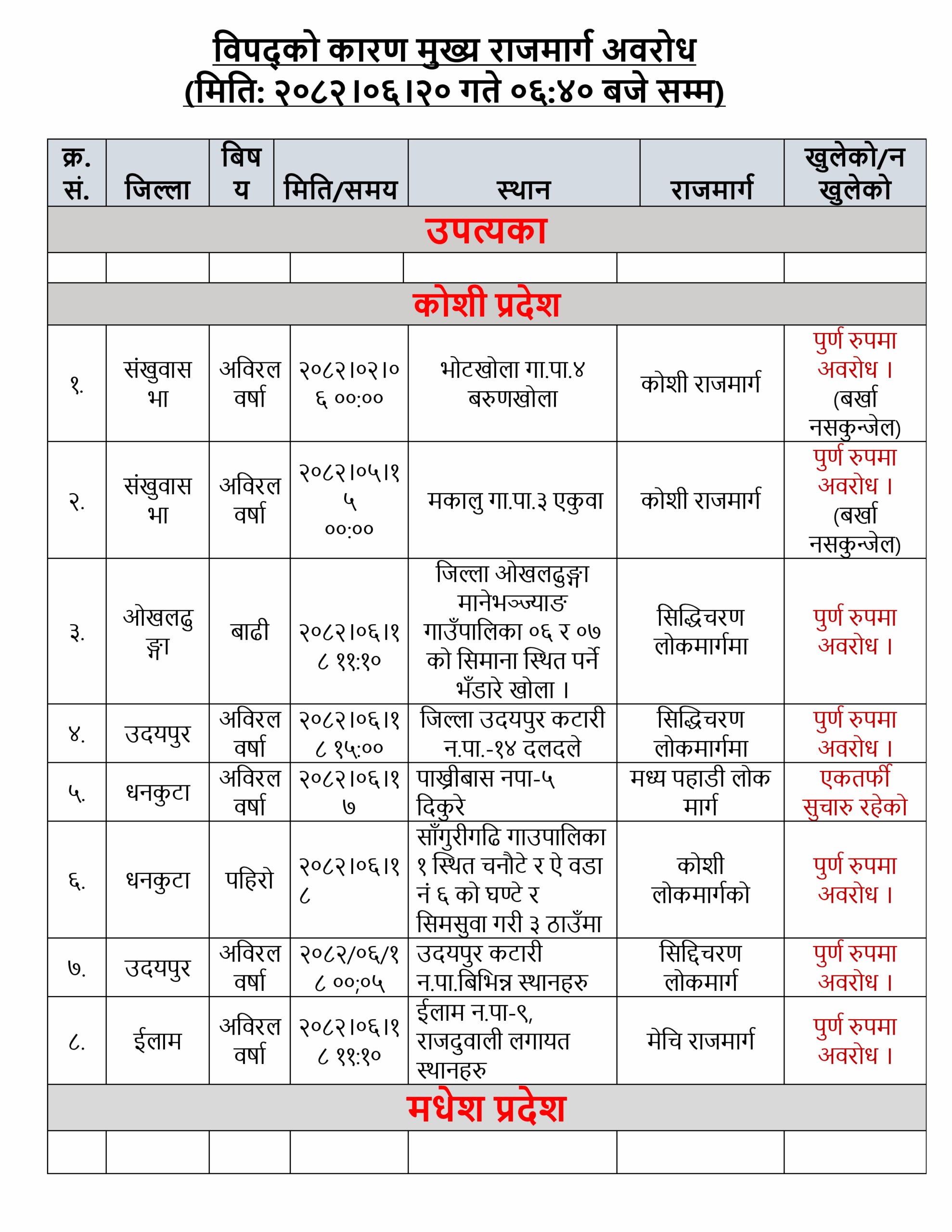 सिन्धुपाल्चोक भोटेकोशी गाउँपालिका-४ चारकिलोमा पहिरोका कारण अरनिको राजमार्ग पूर्णरुपमा अरुद्ध छ। काभ्रेको रोशी गाउँपालिका-११ माम्तीखोला, डालाबेसी, बुलढुंगा, बाँझोखेतलगायत ठाउँमा पहिरोका कारण बिपी राजमार्ग पूर्णरुपमा अवरुद्ध छ।