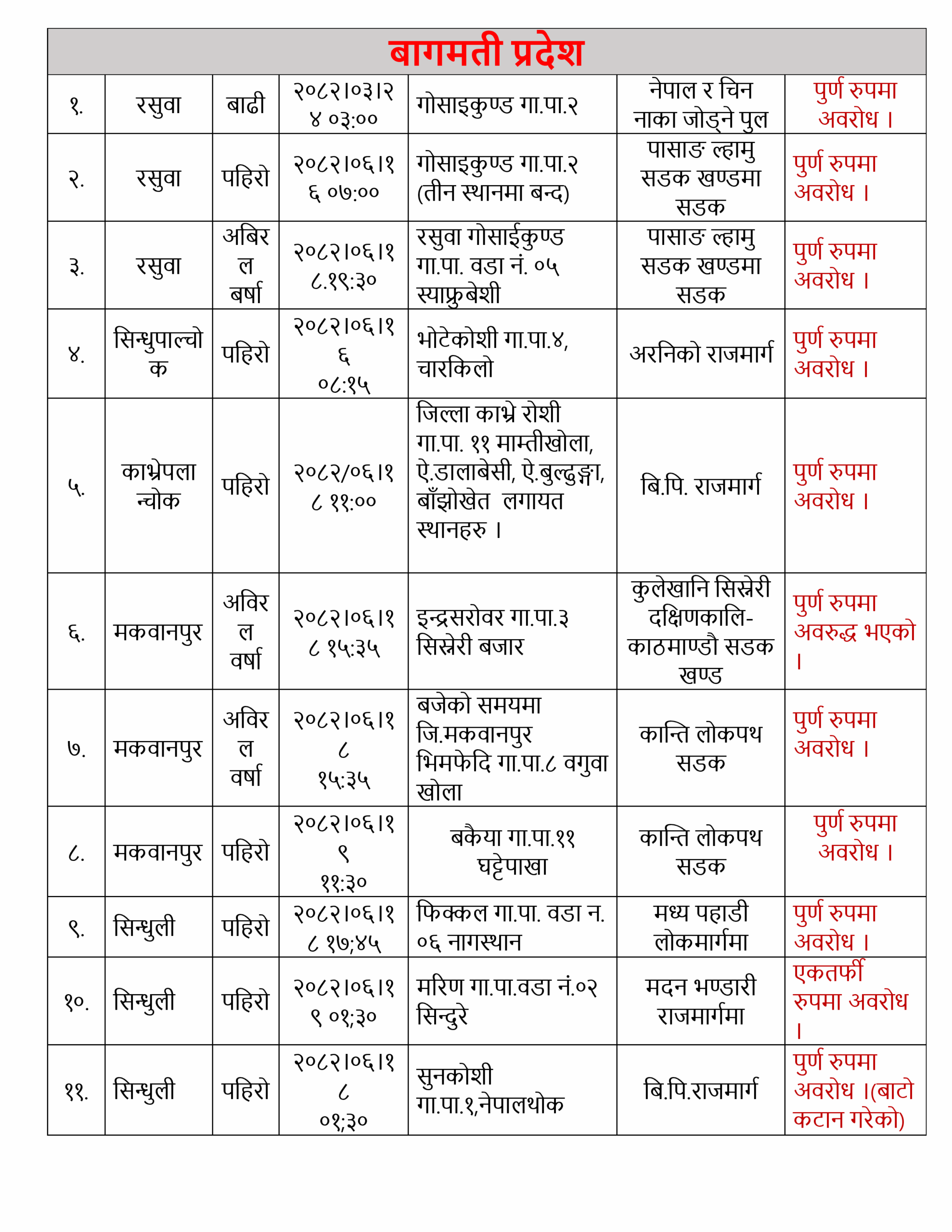 बागमती प्रदेशका अधिकांश सडक अवरुद्ध छन्। रसुवाको गोसाइँकुण्ड गाउँपालिका-२ मा नेपाल-चीन जोड्ने पुल बाढीले बगाएका कारण सडक पूर्णरुपमा अवरुद्ध छ।