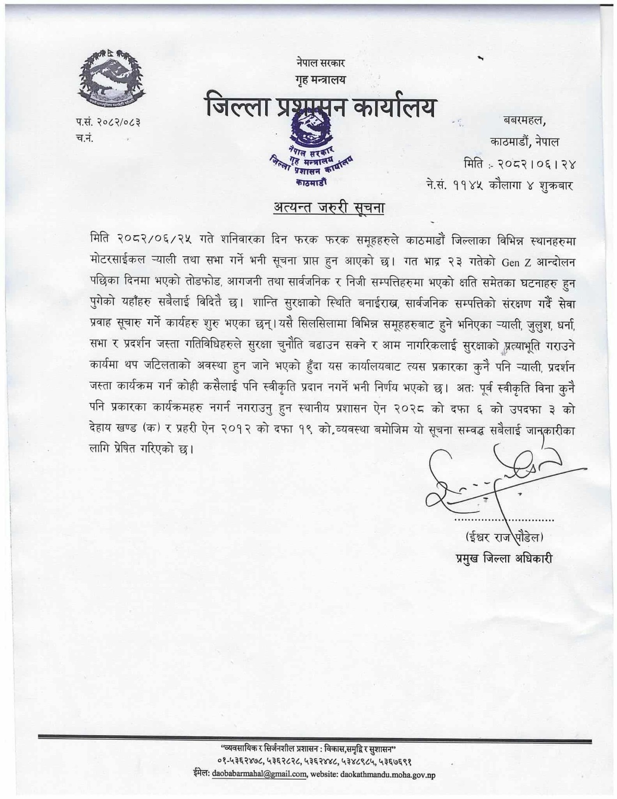 “फरक-फरक समूहले काठमाडौँमा मोटरसाइकल र्याली र सभा गर्ने सूचना आएको छ। र्याली, जुलुस, प्रदर्शनजस्ता कार्यक्रम गर्न कोही कसैलाई पनि स्वीकृति प्रदान नगर्ने भनी निर्णय भएको छ,” पौडेलले भने।
