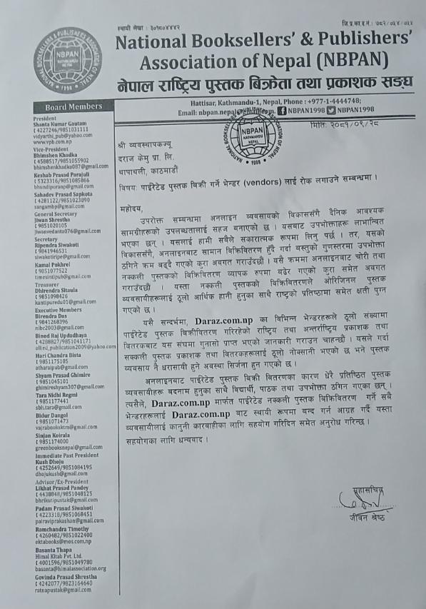 पाइरेटेड पुस्तक बिक्री गर्ने विक्रेतालाई रोक लगाउन आग्रह गर्दै एनबीपीएएनले दराज डटकमलाई लेखेको पत्र।