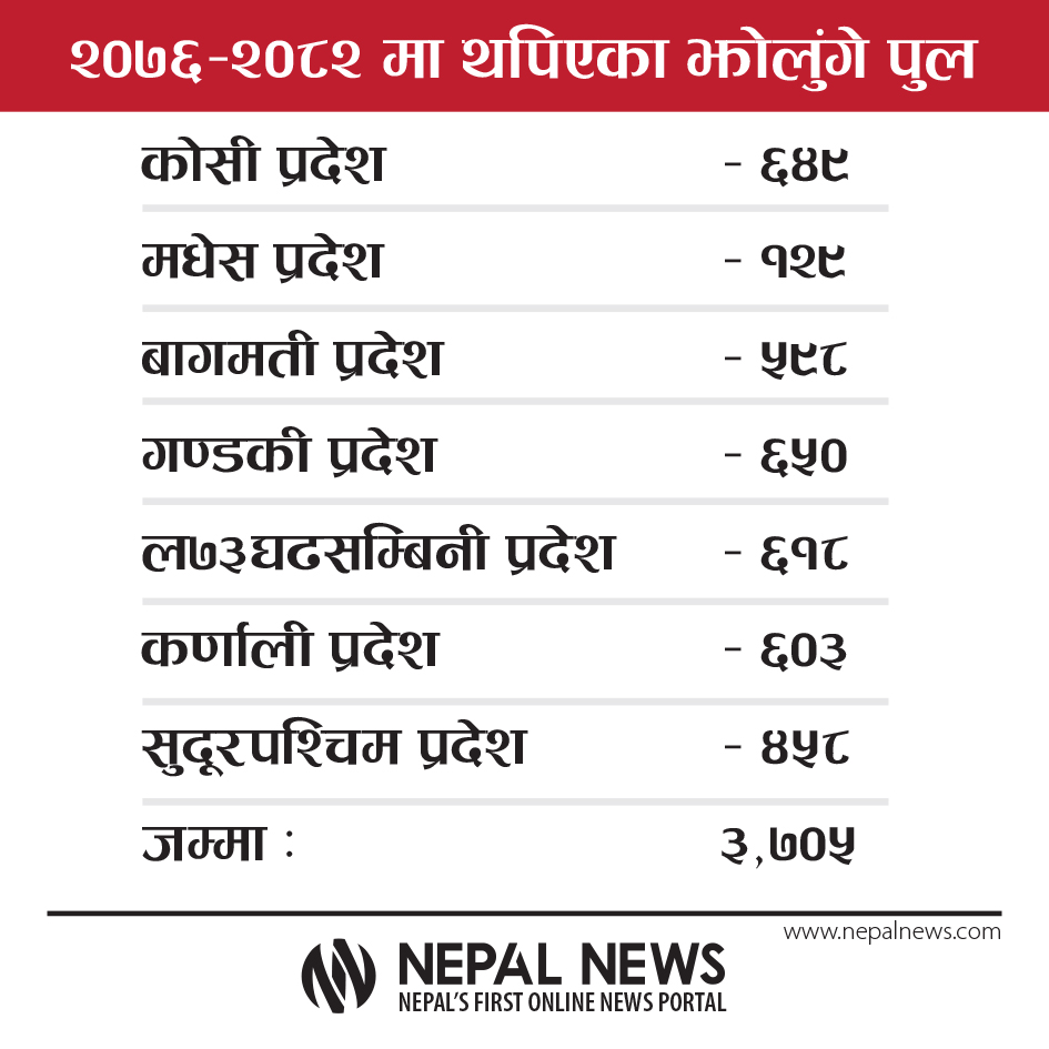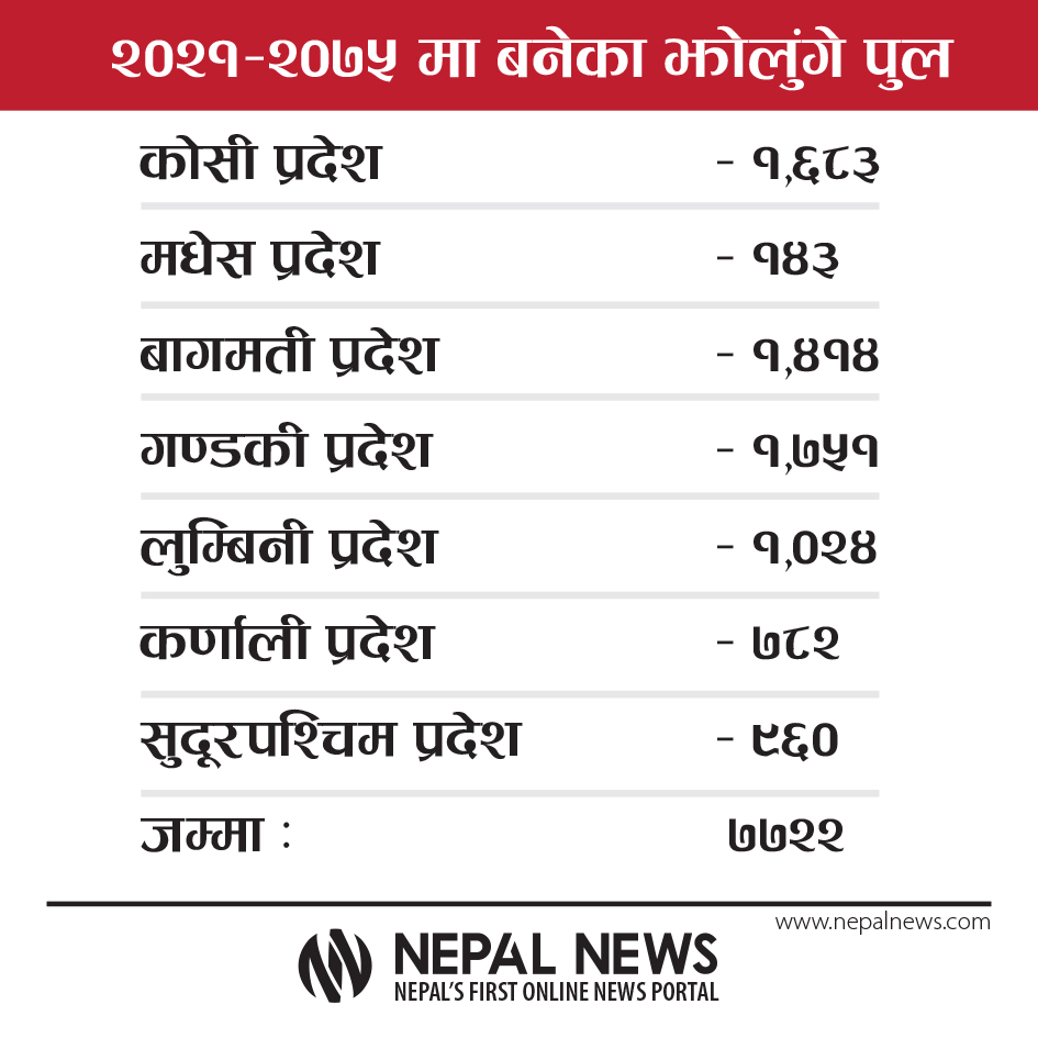 नेपालमा विसं २०२१ देखि असार २०८२ सम्म ११ हजार ४२७ वटा पुल बनिसकेका छन्। स्थानीय पूर्वाधार विकास विभागका अनुसार यस्ता पुल ५-६ महिनाभित्र जोड्न सकिन्छ। १०० मिटर पुल निर्माण गर्न करिब ४० देखि ५० लाख रुपैयाँसम्म खर्च हुन्छ। जुन बीचमा पिलर राखेर सडक पुल बनाउनुभन्दा सस्तो पर्छ।