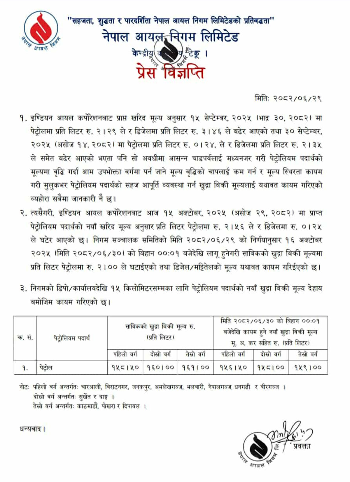निगमका अनुसार डिजेल, मट्टितेल र हवाई इन्धनको मूल्य भने यथावत् छ।