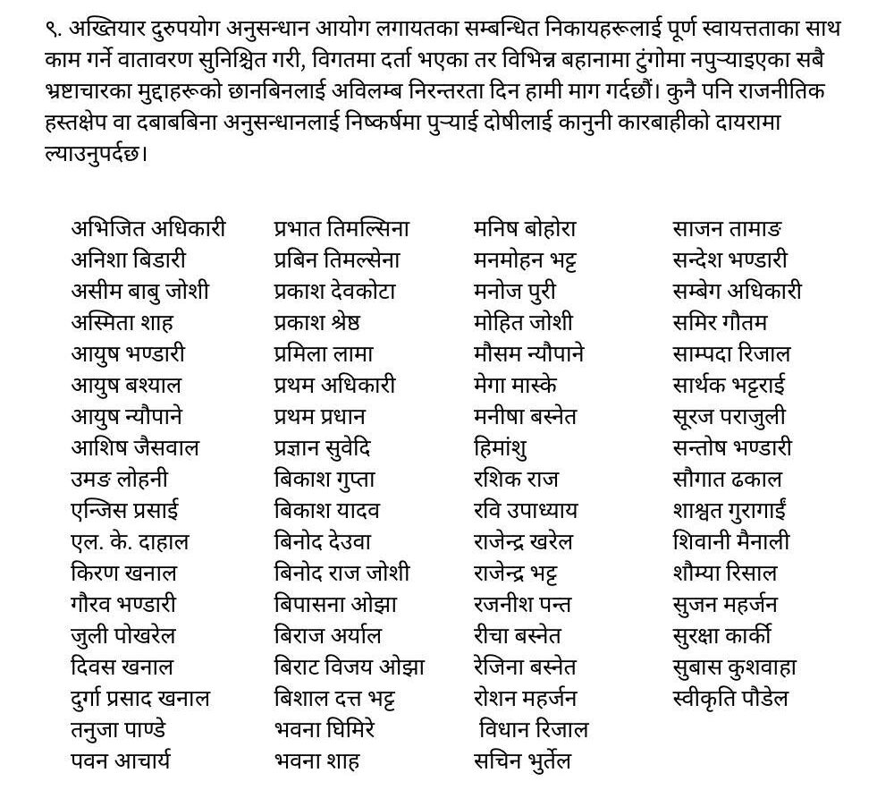यस्तै अख्तियार दुरुपयोग अनुसन्धान आयोगलगायतका सम्बन्धित निकायहरूलाई पूर्ण स्वायत्तताका साथ काम गर्ने वातावरण सुनिश्चित गरी, विगतमा दर्ता भएका तर विभिन्न बहानामा टुंगोमा नपुर्याइएका सबै भ्रष्टाचारका मुद्दाहरूको छानबिनलाई अविलम्ब निरन्तरता दिन उनीहरूको माग छ।