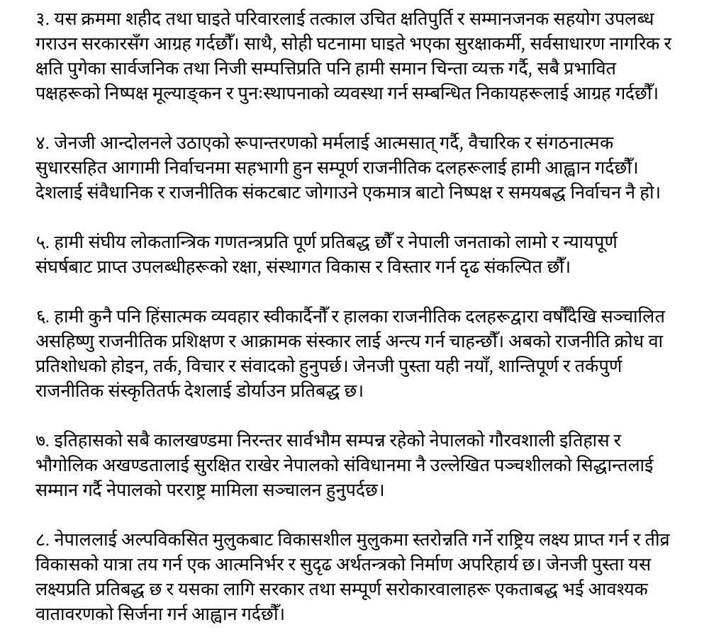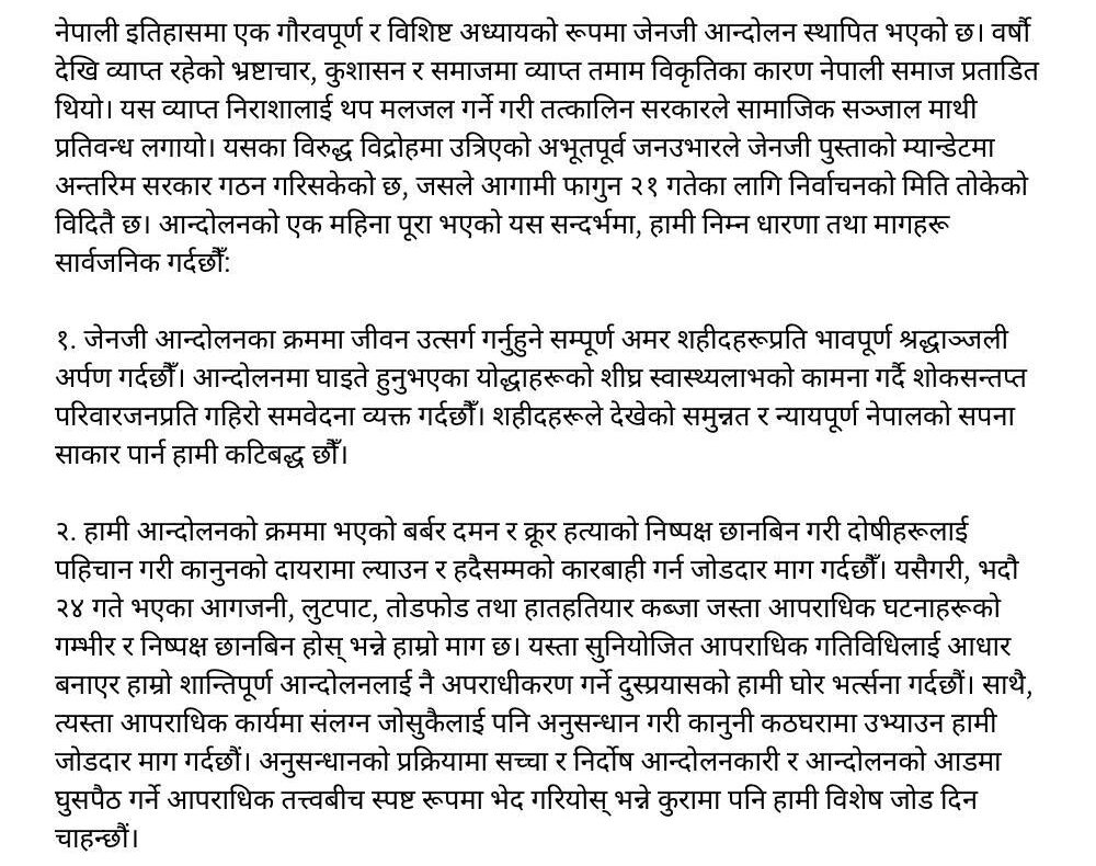 विभिन्न नौ बुँदे माग अघि सार्दै उनीहरूले जेन-जी आन्दोलनले उठाएको रूपान्तरणको मर्मलाई आत्मसात् गर्दै, वैचारिक र संगठनात्मक सुधारसहित आगामी निर्वाचनमा सहभागी हुन सम्पूर्ण राजनीतिक दलहरूलाई आह्वानसमेत गरेका छन्। विज्ञप्तिमा भनिएको छ, ‘देशलाई संवैधानिक र राजनीतिक संकटबाट जोगाउने एक मात्र बाटो निष्पक्ष र समयबद्ध निर्वाचन नै हो।’