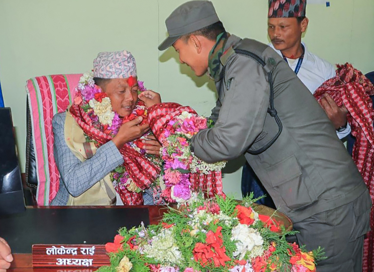 दिप्रुङ चुइचुम्मा गाउँपालिका प्रमुखको स्वागतमा टीका लगाइदिँदै गाउँ प्रहरी। तस्बिर : गाउँपालिकाको फेसबुक पेज