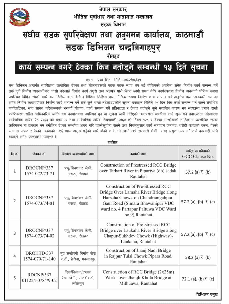 सडक डिभिजन कार्यालय विराटनगर, चन्द्रनिगाहपुर तथा निर्देशनालयले पाँच/पाँच र नुवाकोटले २ वटा गरी १७ वटा ठेक्का किन नतोड्ने रु भन्दै शुक्रवार सार्वजनिक सूचना जारी गरेका छन्। ठेका तोड्न प्रक्रिया बढाइएका अधिकांश पुल निर्माणका रहेका छन्।