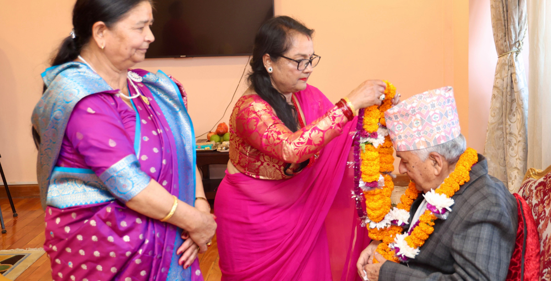 काठमाडौँ। राष्ट्रपति रामचन्द्र पौडेलले बहिनीहरू शारदा पण्डित र चन्दा ओझाको हातबाट शुभसाइतमा यस वर्षको तिहारको टीका लगाएका छन्।
