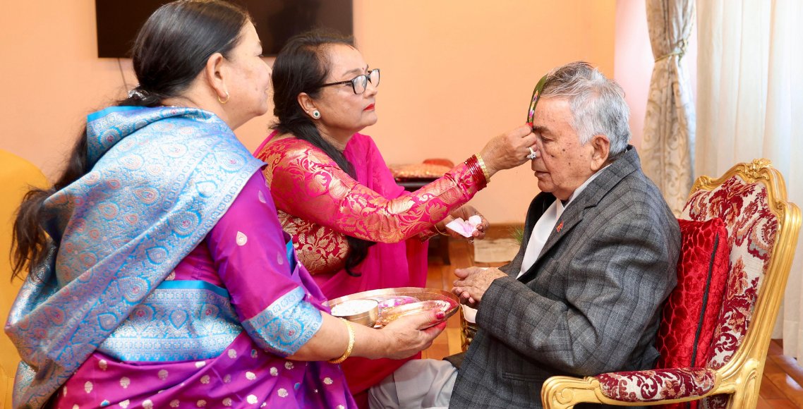 राष्ट्रपति पौडेलले बिहीबार राष्ट्रपति भवन शितलनिवासमा ११ः३९ बजेको शुभसाइतमा बहिनीहरू शारदा र चन्दाको हातबाट टीका लगाएको राष्ट्रपतिको स्वकीय सचिवालयले जनाएको छ।