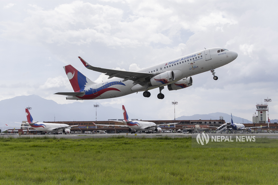 त्रिभुवन अन्तर्राष्ट्रिय विमानस्थलबाट उडान भरिरहेको नेपाल वायुसेवा निगमको सगरमाथा र पार्किङमा राखिएका मकालु र अन्नपूर्ण जहाज। तस्बिर : बिक्रम राई/नेपालन्युज