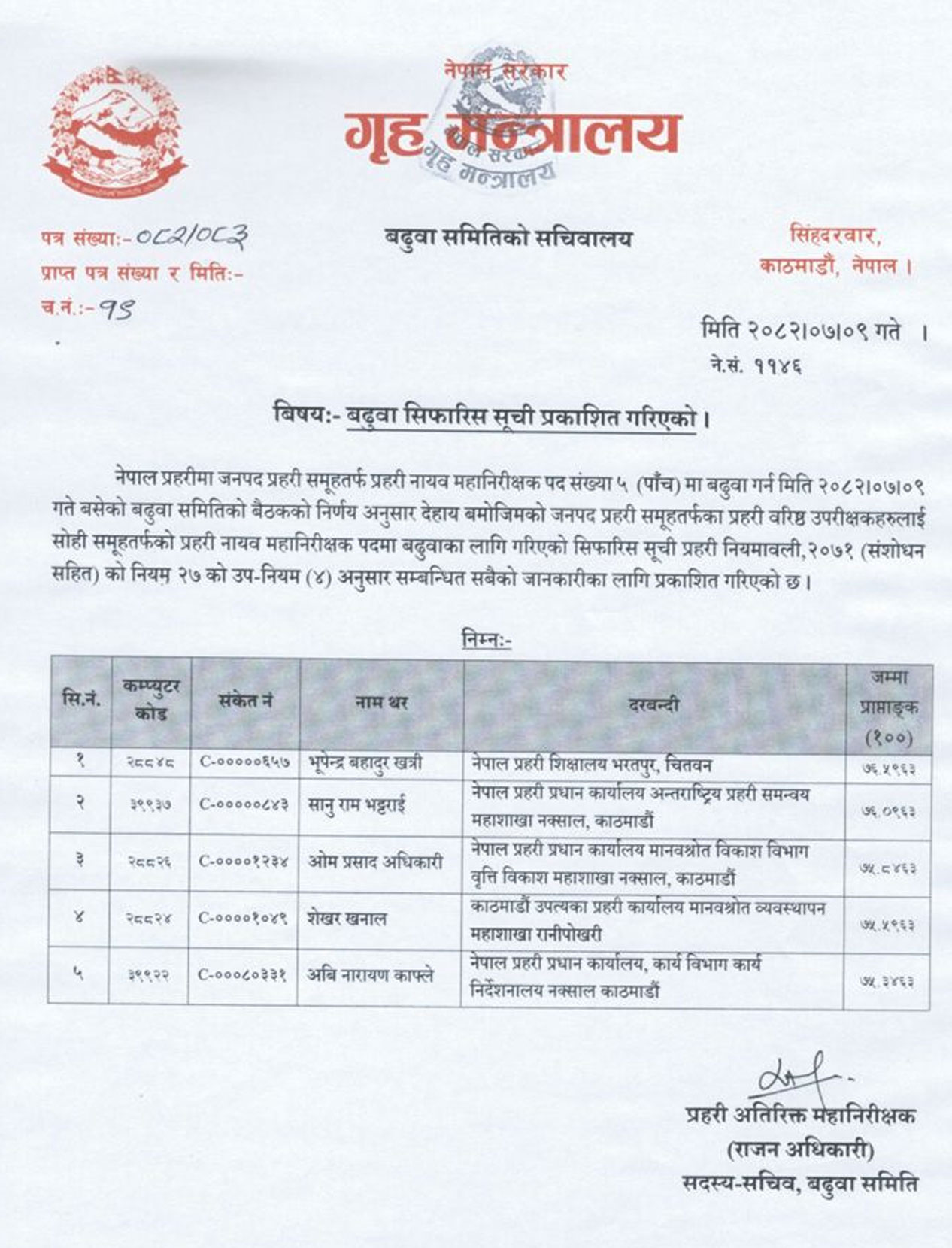 बढुवा सिफारिस समितिको आइतबार बसेको बैठकले बढुवाका लागि सिफारिस गरेको हो ।