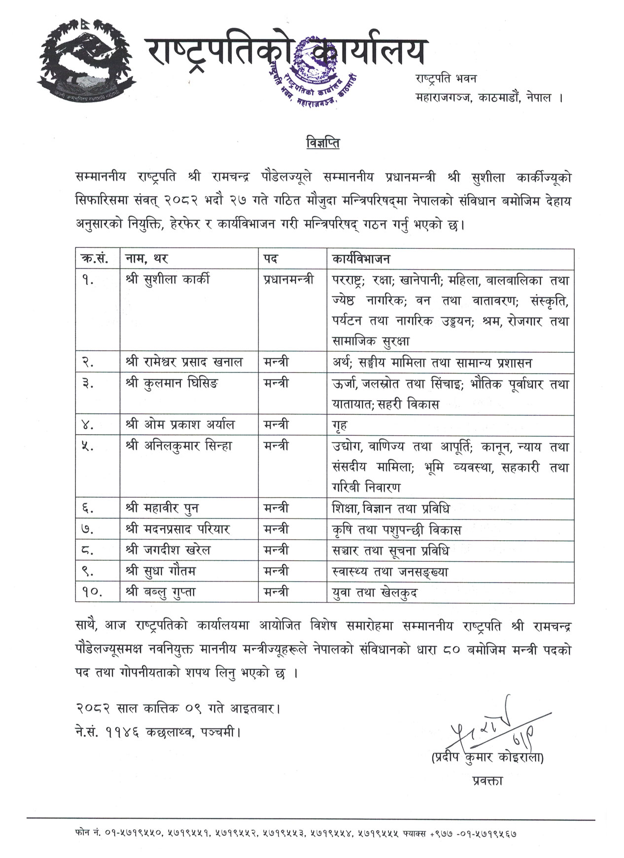 शीतलनिवासमा आइतबार आयोजित समारोहमा मन्त्रीद्वय गौतम र गुप्तालाई राष्ट्रपति रामचन्द्र पौडेलले पद तथा गोपनीयताको शपथ गराए।
