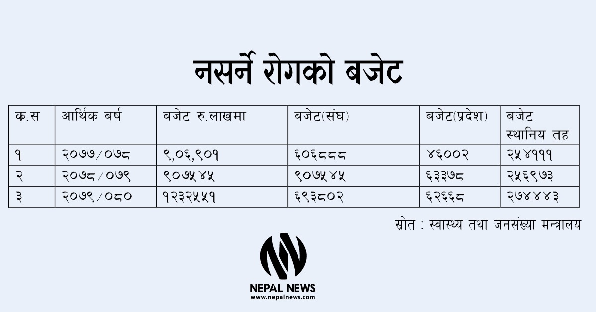 देशभर बढ्दो नसर्ने रोगको कार्यक्रम सुरु गर्न २०८२/८३ मा ९५ अर्ब ८१ करोड बजेट विनियोजन गरिएको छ। जुन कुल बजेटको ४.७७ प्रतिशत मात्रै हो। स्वास्थ्य क्षेत्रमा यसपटक एक खर्ब बजेट आउने अनुमान थियो। नसर्ने तथा मानसिक स्वास्थ्य शाखाका अनुसार नसर्ने रोगको बोझ रोक्न विभिन्न रोकथामका कार्यक्रम सञ्चालन गर्ने योजना बनाइएको शाखाका प्रमुख फणीन्द्र बराल बताउँछन्। भन्छन्, “बजेट कम हुँदा रोकथामका प्रभावकारी कार्यक्रमबिना यी रोगको बोझ घटाउन सकिँदैन।”