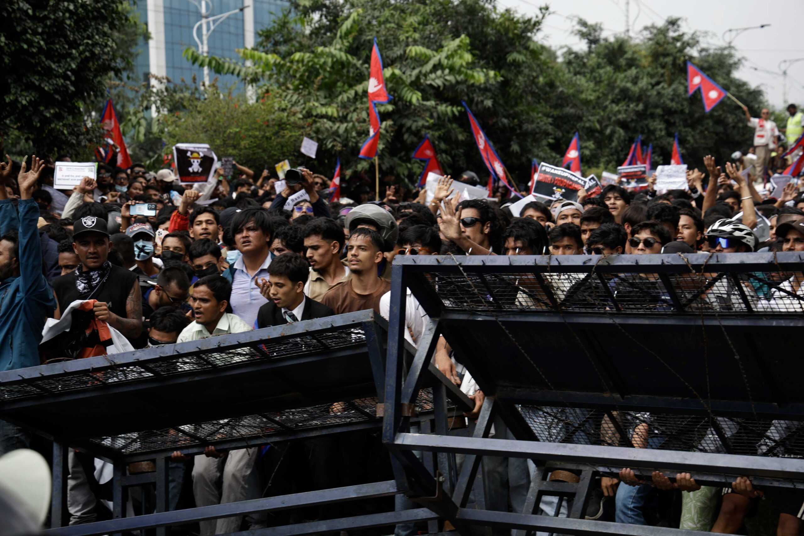 जेन-जी आन्दोलनको पहिलो दिन २३ भदौमा प्रहरीको ब्यारिकेड तोडिरहेका प्रदर्शनकारी। तस्बिर : बिक्रम राई/नेपालन्युज