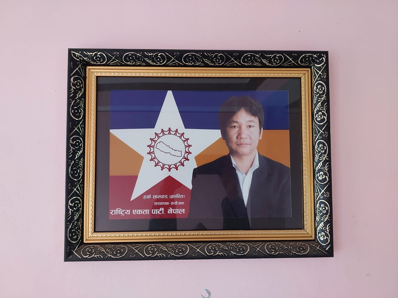हर्क साम्पाङको घरको भित्तामा झुन्ड्याइएको राष्ट्रिय एकता पार्टीको संस्थापक संयोजक रहेको तस्बिर
