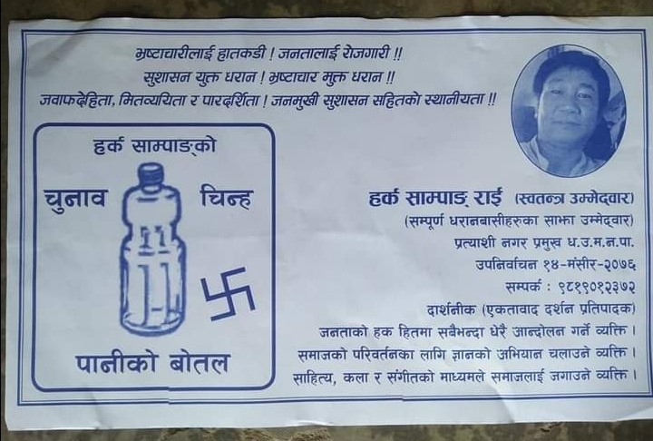 आफूलाई एकतावाद दर्शनका प्रतिपादक (दार्शनिक) रहेको भन्दै साम्पाङले वितरण गरेको चुनावी पर्चा। तस्बिर : साम्पाङको फेसबुक