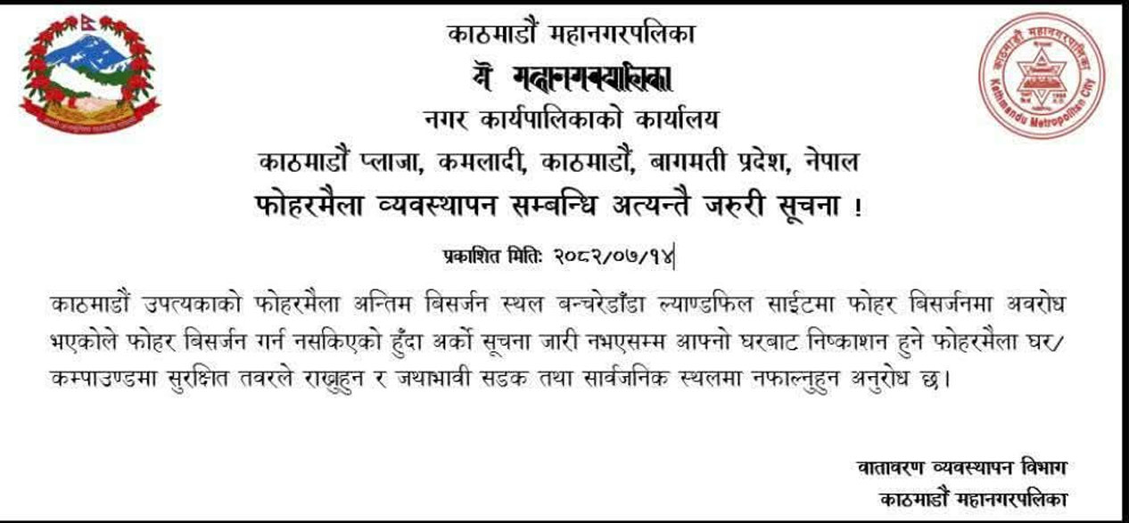 उपत्यकाको फोहोरमैला अन्तिम विसर्जन स्थल बन्चरेडाँडा ल्यान्डफिल साइटमा अवरोध भएकाले फोहोर बिर्सजन गर्न नसकिएको सूचनामार्फत महानगरले जनाएको हो।