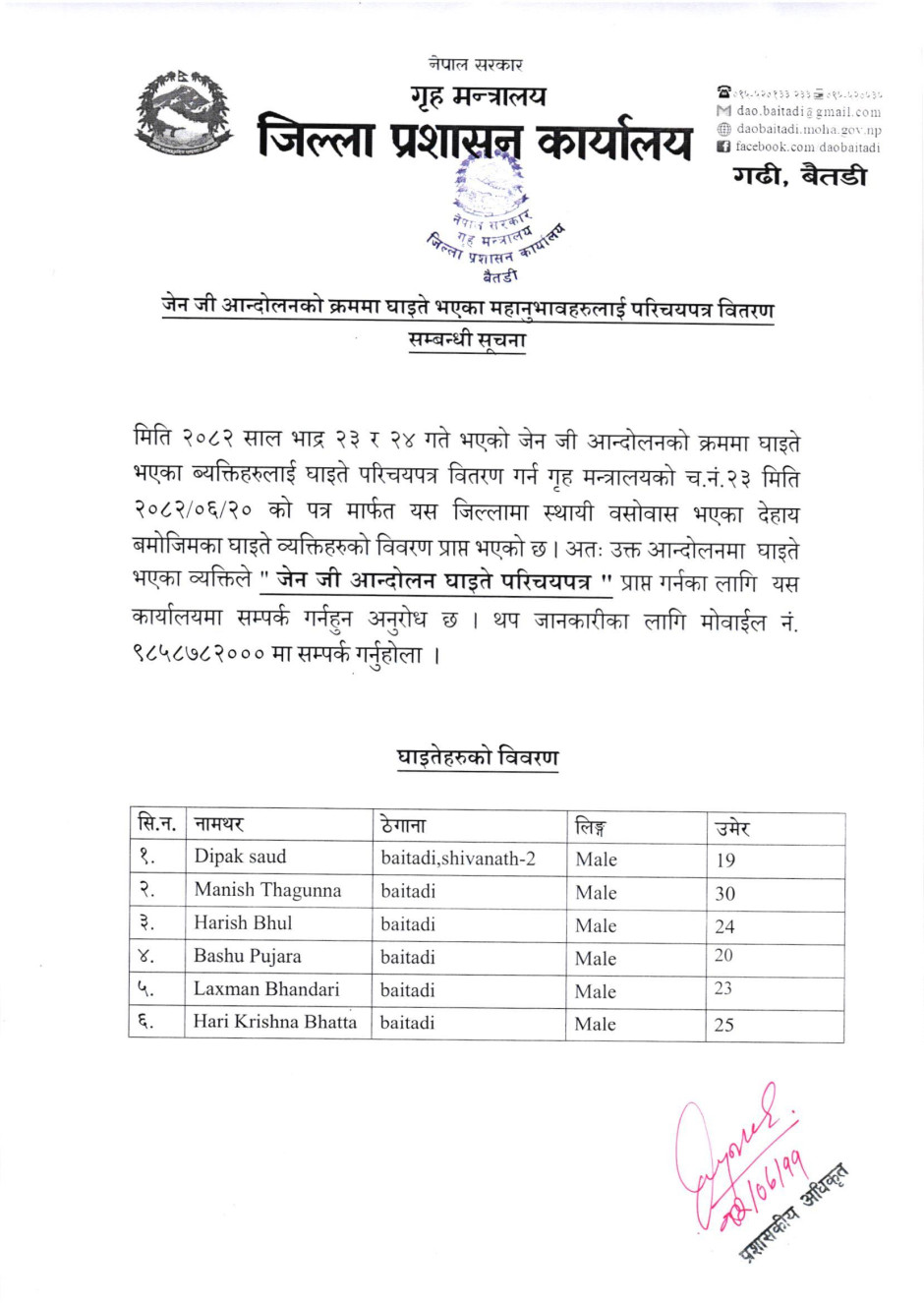 घाइते परिचयपत्र वितरणका लागि सूची सार्वजनिक गरिएको बैतडीका प्रमुख जिल्ला अधिकारी पुण्यविक्रम पौडेलले जानकारी दिए। उनले भने, “गत भदौ २३ र २४ गतेको आन्दोलनका क्रममा घाइते भएकाहरूको सूची स्वास्थ्य मन्त्रालय हुँदै गृह मन्त्रालयले हामीलाई (जिल्ला प्रशासन कार्यालय) पठाएको छ। त्यही सूची हामीले सार्वजनिक गरेका छौँ।”