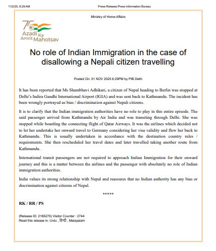 विज्ञप्तिमा भनिएको छ कि नेपाली नागरिक शाम्भवी अधिकारीलाई फिर्ता पठाउने निर्णय एयरलाइन्स कम्पनीले आफ्नै भिसा वैधता जाँचका आधारमा गरेको हो, जसमा भारतीय अध्यागमन निकायको भूमिका थिएन।