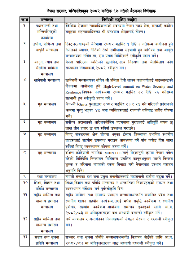 काठमाडौँ। सोमबार बसेको मन्त्रिपरिषद्‌ बैठकका निर्णयहरू सार्वजनिक भएका छन्। १७ कात्तिकको बैठकले गरेका १३ निर्णयहरू सार्वजनिक गरिएका हुन्।