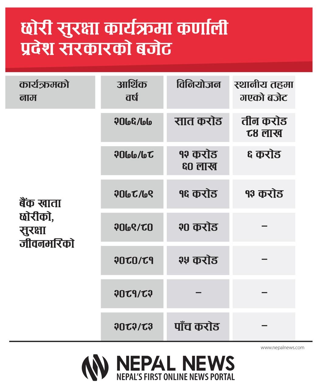 कर्णाली प्रदेशमा छोरीहरूको आर्थिक-सामाजिक सुरक्षाका लागि प्रदेश सरकारले लागु गरेको ‘बैंक खाता छोरीको, सुरक्षा जीवनभरिको’ कार्यक्रम चार वर्षदेखि बेवारिसे